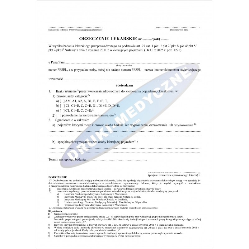 Orzeczenie lekarskie dla kierowców - NOWY, AKTUALNY WZÓR - Dz.U. z 2025 r. poz. 1226; format A5, samokopia, 100 kart w bloczku.