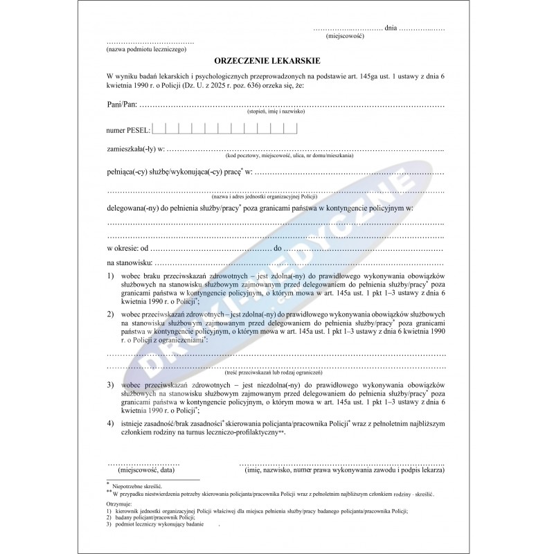 Orzeczenie lekarskie dla policjantów - nowy wzór obowiązującego orzeczenia, zgodny z Rozporządzeniem Ministra Zdrowia.